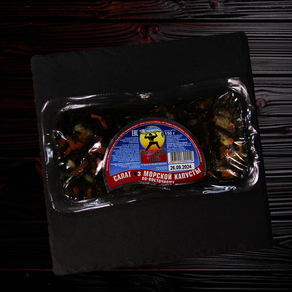 Состав: морская капуста, соевый соус, кунжутное масло, чеснок, имбирь, специи.