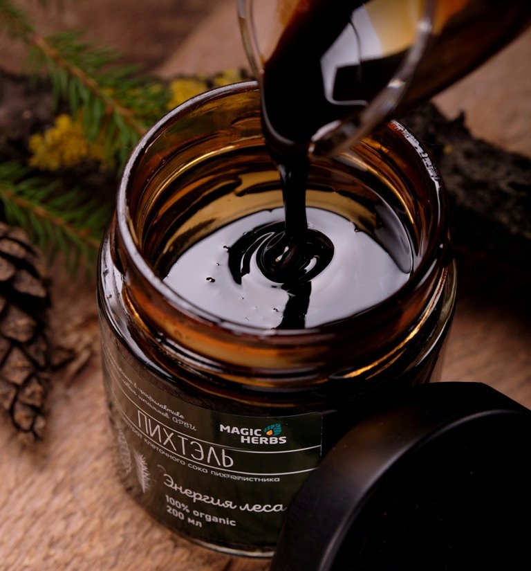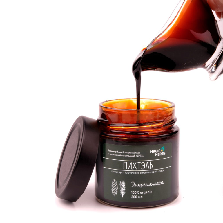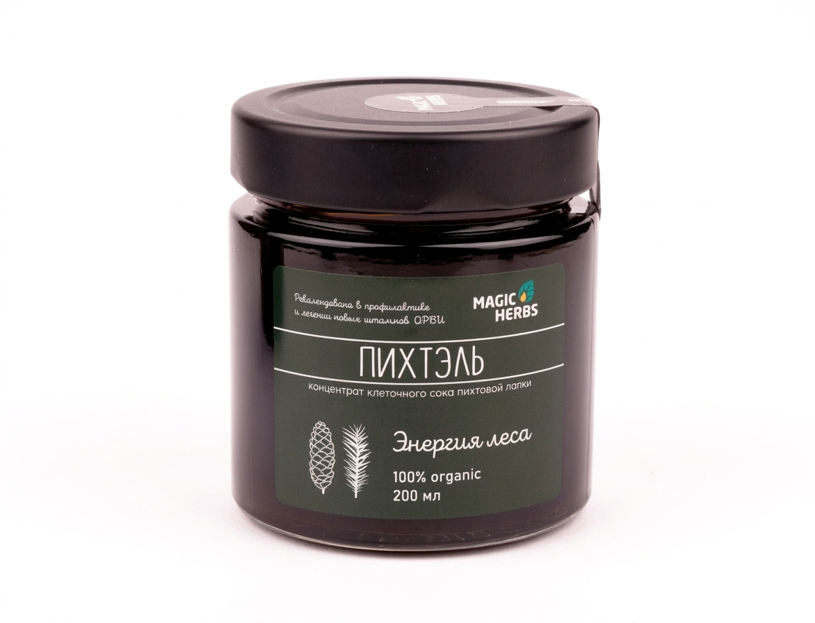 Пихтель — это живой клеточный сок хвои пихты сибирской (Abies sibirica), полученный методом бережной вакуумной экстракции при низких температурах. Этот способ позволяет сохранить природную формулу витаминов и фитонцидов в неизменном виде.